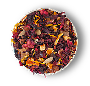 Лепестки каркаде с кусочками шиповника, банана, корицы, ананаса, цедрой апельсина, виноградом, ягодами вишни, миндалем, гвоздикой, лепестками календулы и китайской розы. Темно-вишневый настой с пряным ягодным вкусом с кислинкой и ярким ароматом спелых вишен.