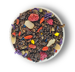 Китайский зеленый чай с ягодами годжи, миндалем, кондитерской посыпкой «месяц и звезды», лепестками цветов мальвы и василька. Светло-зеленый настой имеет терпкий вкус с кислинкой и ягодный привкус с ароматами малины и вишни.