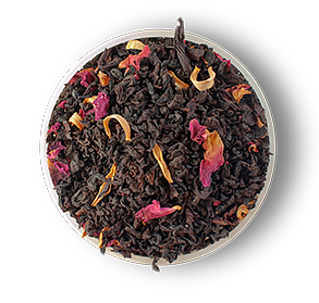Цейлонский черный чай с лепестками цветов розы, апельсина и ягодами малины. Коричнево-красный настой имеет цитрусовый привкус и аромат малины с нежными нотками ванили.