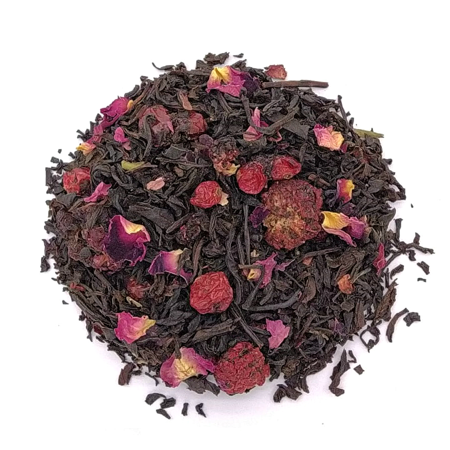 Чёрный чай с ягодами ежевики и красной смородины, кусочками клубники и лепестками красной розы.