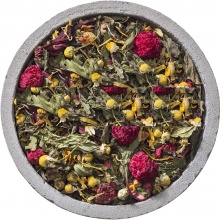 Фруктово-травяной сбор: кусочки яблок, каркадэ, мята, лист смородины, малина, цветки ромашки, лепестки календулы, ягоды малины и ежевики, ароматизированный натуральными маслами.