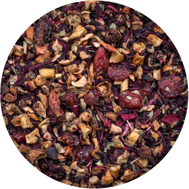 Освежающая фруктовая смесь в тропическом стиле на основе гибискуса. Можно употреблять в горячем виде или использовать в качестве основы для холодного чая. Состав: каркаде, вишня, шиповник, клюква, черная смородина.