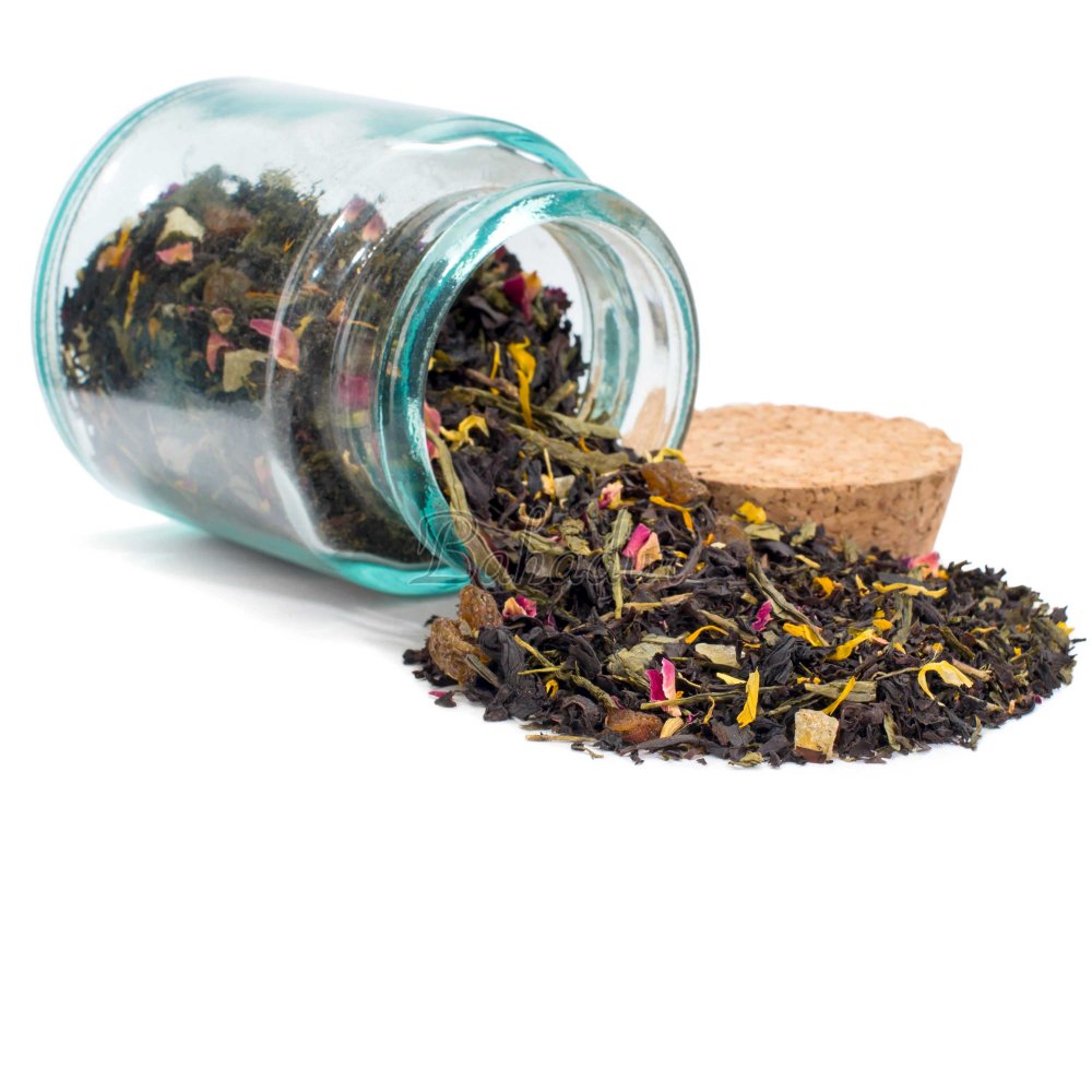 Королевский микс первоклассного черного чая с индийских плантаций и зеленого чая высшего сорта из Китая, обрамленный медовым изюмом, лепесточками мальвы, розы и календулы, кубиками спелой тайской папайи и органическими эфирами.