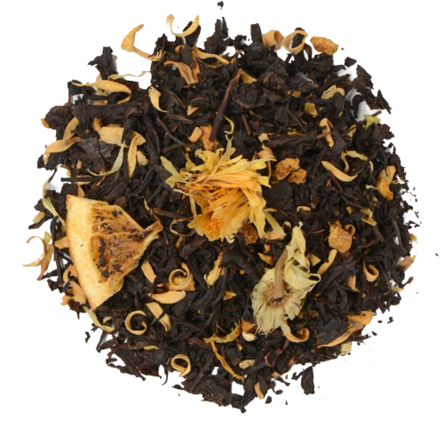 Золотисто-коричневые листочки чая, собранного на индийских плантациях, с кусочками апельсина и пряного корня имбиря.