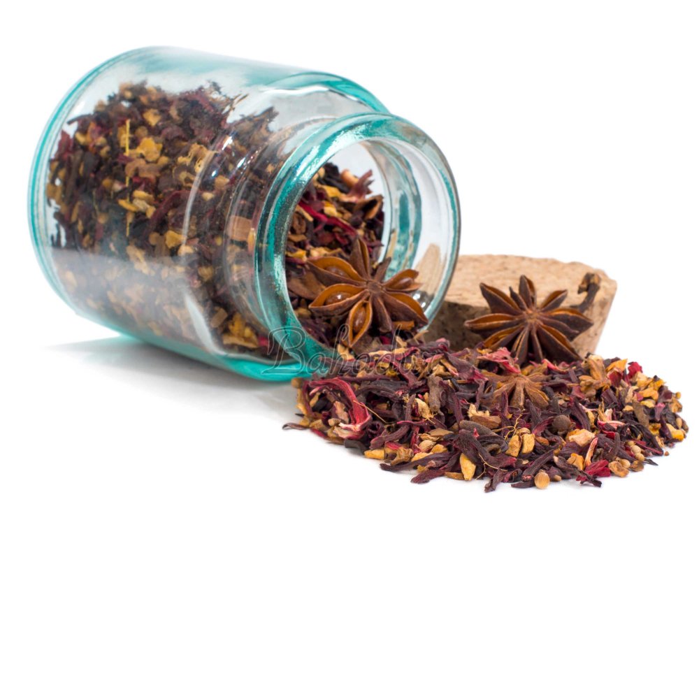 Согревающий, ароматный чайный глинтвейн из крупных лепестков гибискуса, яблочных кубиков, сушеной корочки апельсина, рубленого имбиря, пряной гвоздики, дробленной корицы, бадьяна и кардамона, дополненный органическими маслами.
