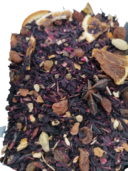 Каркаде, изюм, имбирь, корица, бадьян, тмин, гвоздика, горошины душистого перца, сегменты апельсина, натуральный аромат пряностей.