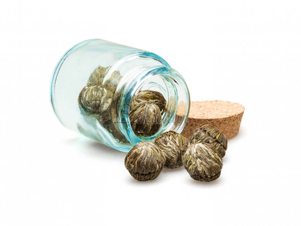 Связанный чай, представляющий собой купаж китайского зеленого чая, цветов жасмина, тигровой лилии и османтуса.