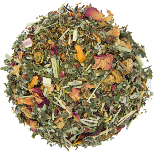 Легкий и свежий сбор из мяты, мелиссы, лимонной травы, апельсиновых корочек, ромашки и каркаде, дополненный клубничными листочками, плодами аронии и шиповником.